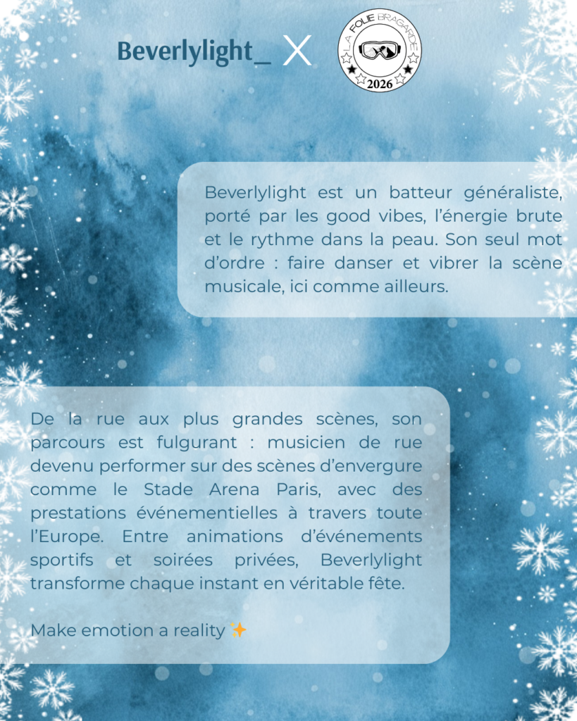 GĂ©nĂ©raliste et instinctif, il joue avec les rythmes comme avec les Ă©motions, alternant Ă©nergie brute et subtilitĂ© pour sâadapter Ă chaque ambiance. VĂ©ritable moteur de la scĂšne, beverlylight_ impose une prĂ©sence scĂ©nique intense, une cadence entraĂźnante et une connexion immĂ©diate avec le public. PrĂ©parez-vous Ă vibrer et Ă danser : il est prĂȘt Ă faire battre le cĆur de la Folie Bragarde âš
